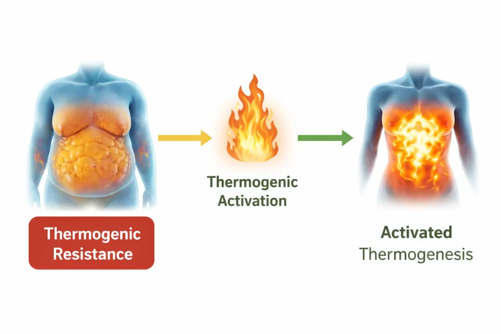 A state where the body gradually loses its ability to enter thermogenesis, the natural process where stored fat is converted into usable energy.